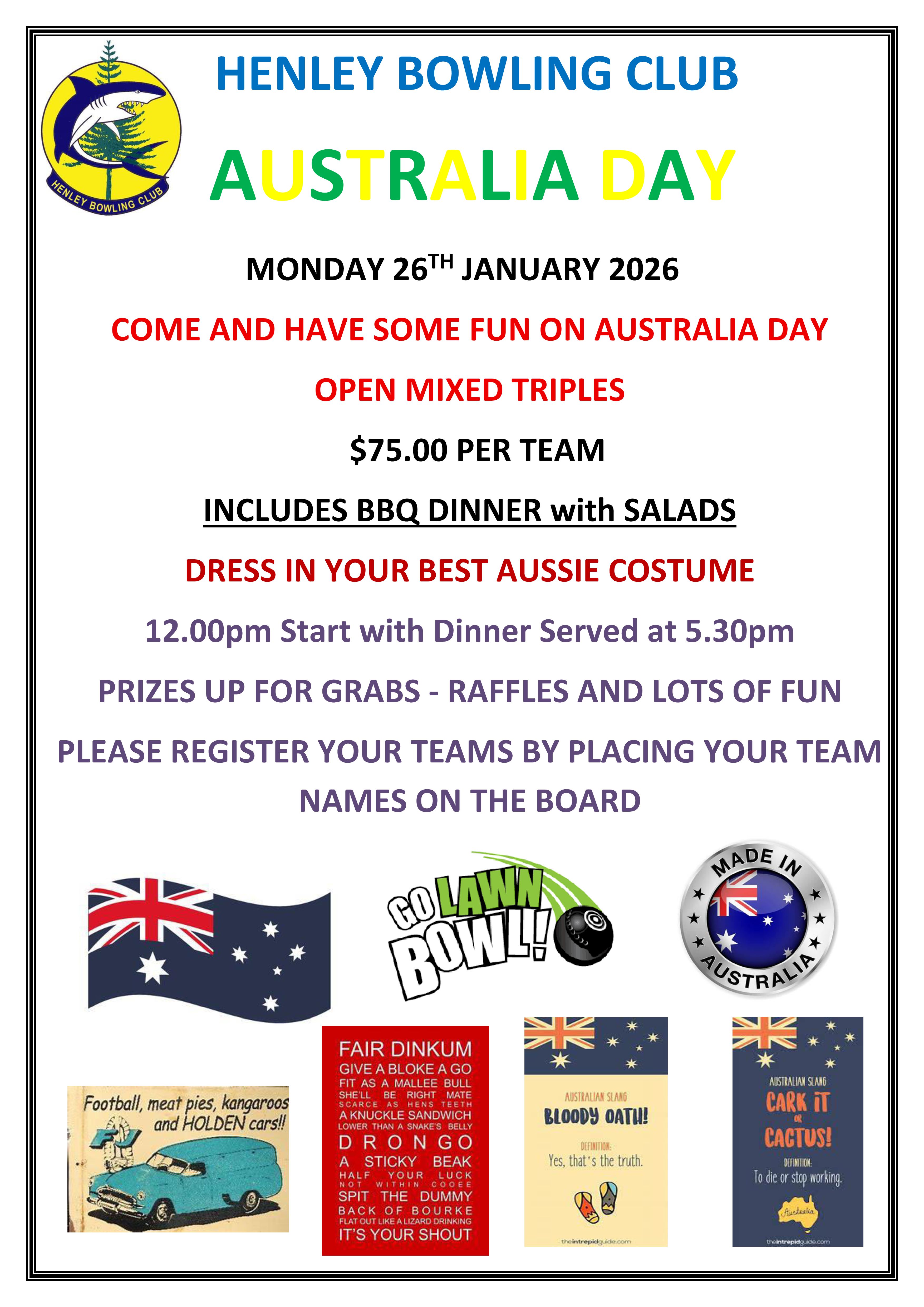 Come along and celebrate Australia Day... 12.00pm Approx. Start, 2 games of triples with friends and family followed by BBQ dinner from 5.30pm